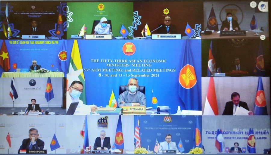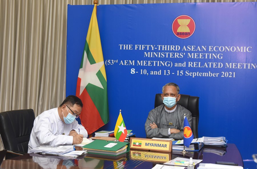 The Union Minister for Investment and Foreign Economic Relations U Aung Naing Oo participated at the 53rd ASEAN Economic Ministersâ Meeting , the 35thASEAN Free Trade Area Council Meeting, the 24thASEAN Investment Area Council Meeting and Economic Ministers and ASEAN Business Advisory Council Consultations held via video conference at 8 AM on 8 September 2021 from the Ministry of Investment and Foreign Economic Relations.