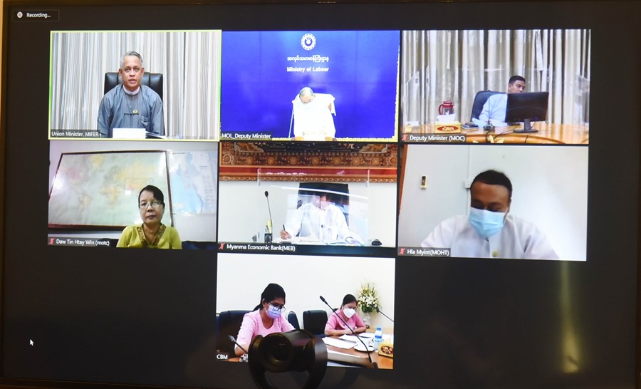 ကိုဗစ်-၁၉ ကြောင့် ဖြစ်ပေါ်လာနိုင်သည့် စီးပွားရေးသက်ရောက်မှုများအပေါ် ကုစားရေး လုပ်ငန်းကော်မတီ၏ အစည်းအဝေး အမှတ်စဉ် (၈/၂၀၂၁) ကို ယနေ့မွန်းလွဲပိုင်းတွင် ရင်းနှီး မြှုပ်နှံမှုနှင့် နိုင်ငံခြားစီးပွားဆက်သွယ်ရေးဝန်ကြီးဌာန၊ ရုံးအမှတ် (၁) ၌ Video Conferencing ဖြင့် ကျင်းပခဲ့ပါသည်။