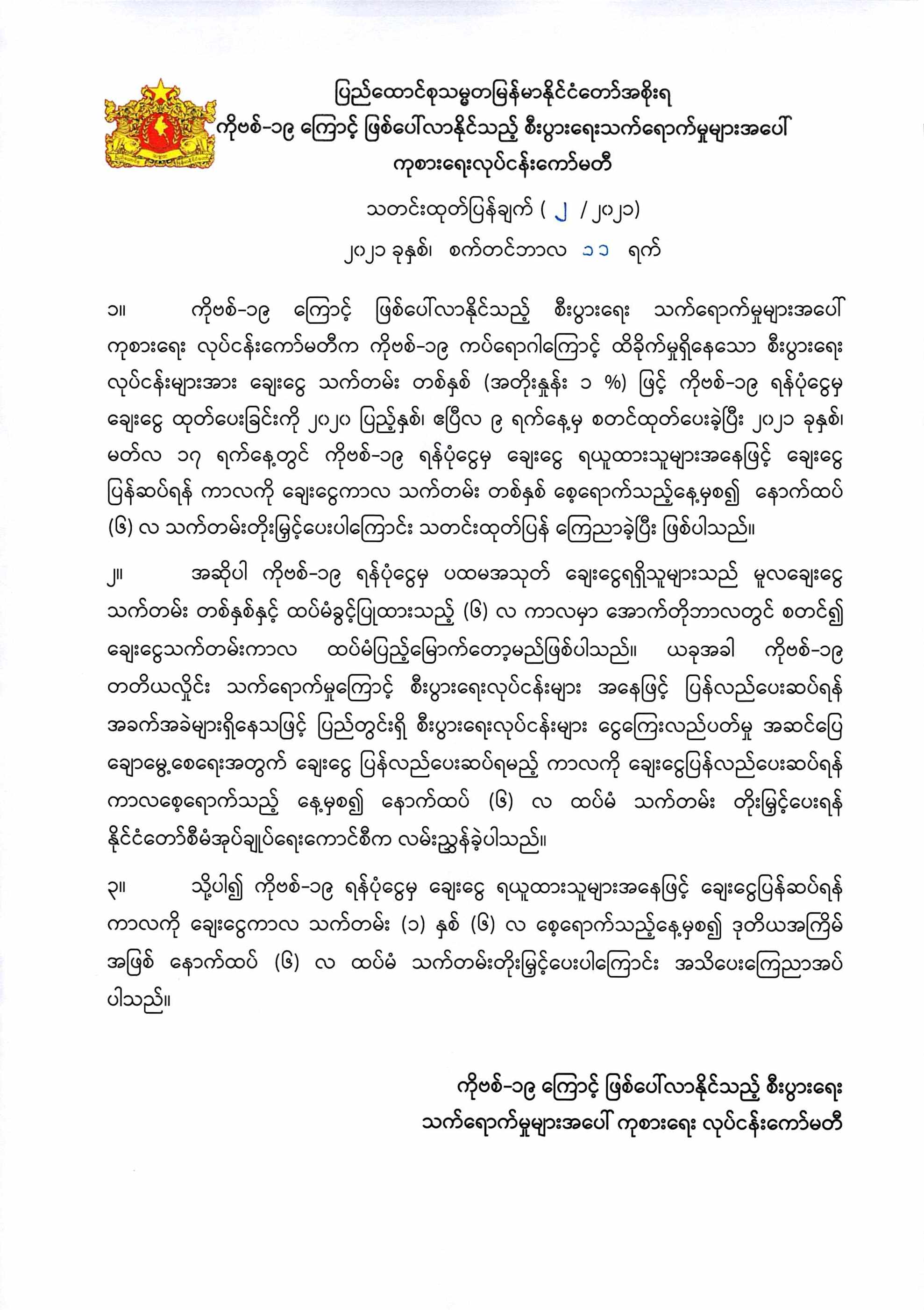 ကိုဗစ်-၁၉ ကြောင့် ဖြစ်ပေါ်လာနိုင်သည့် စီးပွားရေး သက်ရောက်မှုများအပေါ် ကုစားရေး လုပ်ငန်းကော်မတီ သတင်းထုတ်ပြန်ချက်(၂/၂၀၂၁) ထုတ်ပြန်ကြေညာ Post on 11 စက်တင်ဘာ 2021
