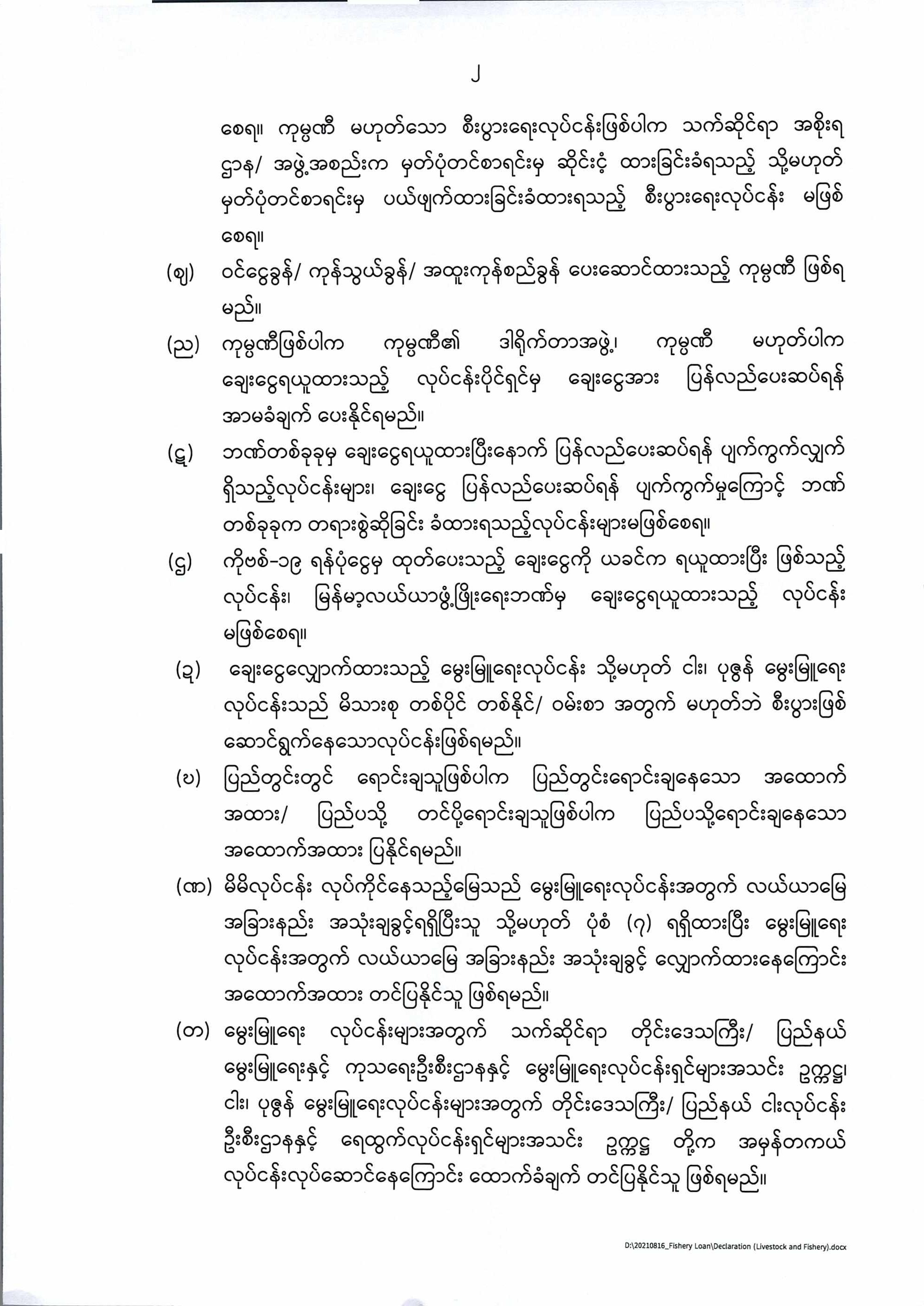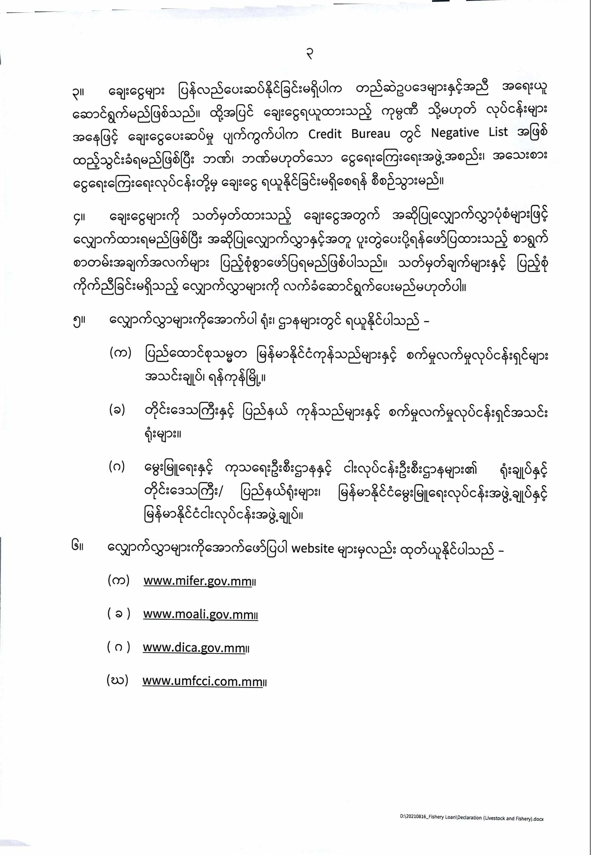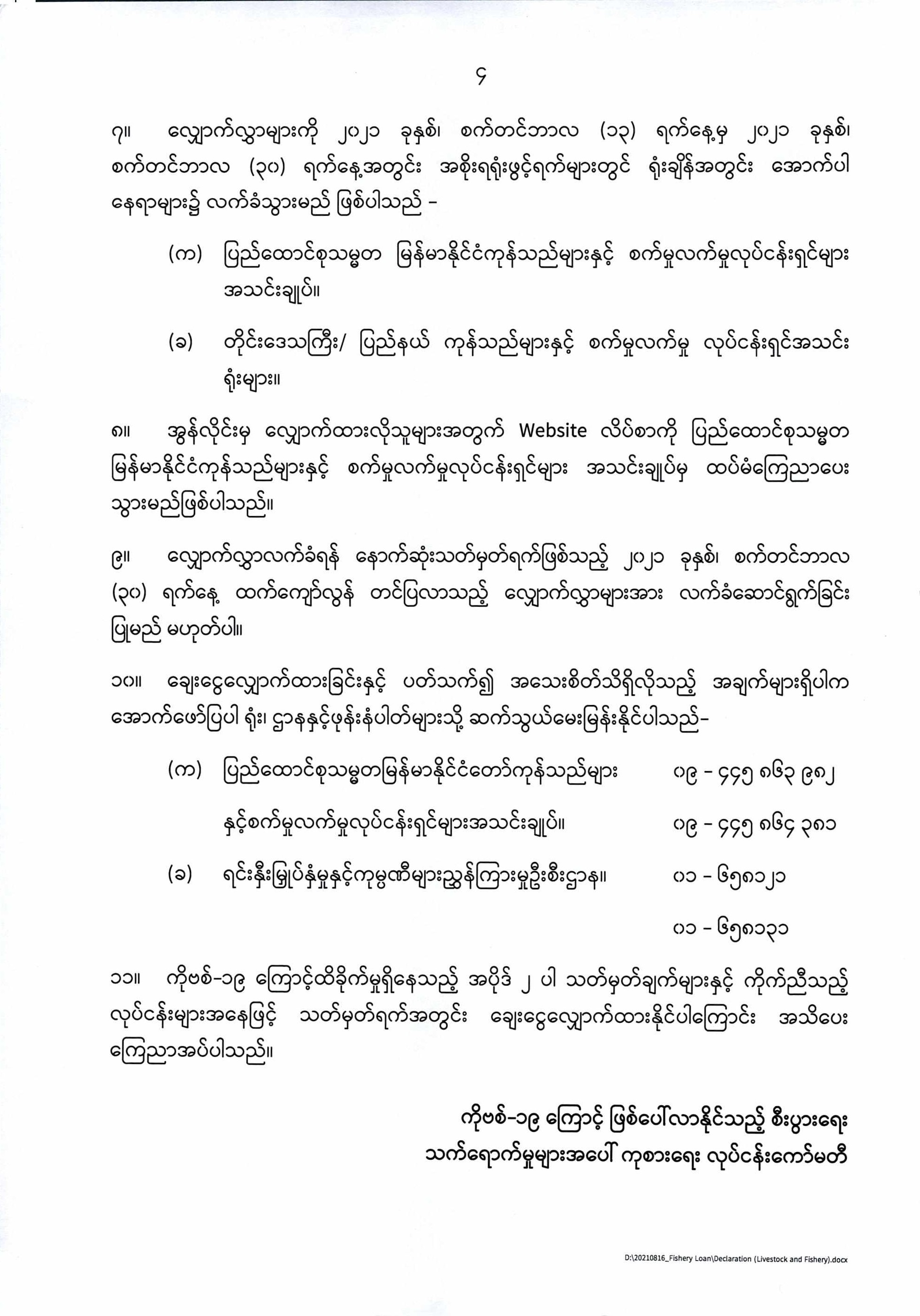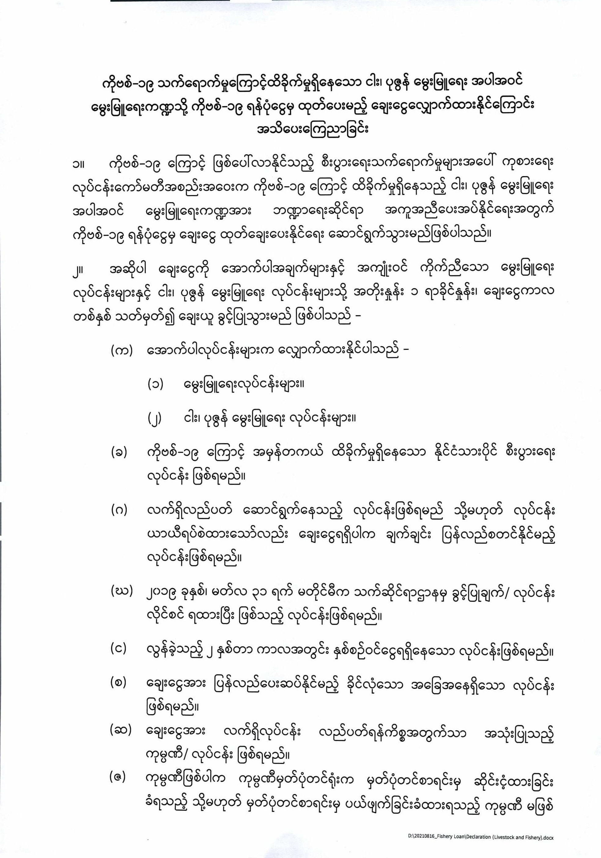 ကိုဗစ်-၁၉ သက်ရောက်မှုကြောင့်ထိခိုက်မှုရှိနေသော ငါး၊ ပုဇွန် မွေးမြူရေး အပါအဝင် မွေးမြူရေးကဏ္ဍသို့ ကိုဗစ်-၁၉ ရန်ပုံငွေမှ ထုတ်ပေးမည့် ချေးငွေလျှောက်ထားနိုင်ကြောင်း အသိပေးကြေညာခြင်း Post on 11 စက်တင်ဘာ 2021 ကြေညာချက်အပြည့်အစုံကို download ရယူနိုင်ပါသည်။